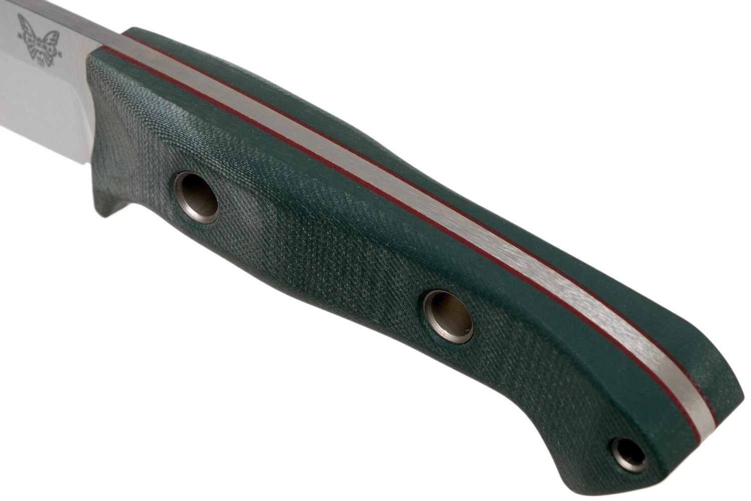 Das Benchmade Bushcrafter 162 ist, wie der Name schon sagt, ein Messer mit feststehender Klinge für das Bushcrafting. Der Griff hat ein spezielles Profil, das sich als sehr komfortabel erweist. Der Griff besteht aus grünem G10, das zusammen mit dem roten vulkanisierten Spacer durch einen gepressten Titanring zusammengehalten wird. Dies ist eine besondere und effektive Konstruktion, die es auch ermöglicht, das Messer an etwas festzubinden. So kannst Du das Messer beispielsweise in einen Speer verwandeln. Die Klinge aus S30V-Pulverstahl verläuft durch den gesamten Griff (Full Tang) und ist sehr schwer. Das Messer kann daher gut für schwere Arbeiten eingesetzt werden.