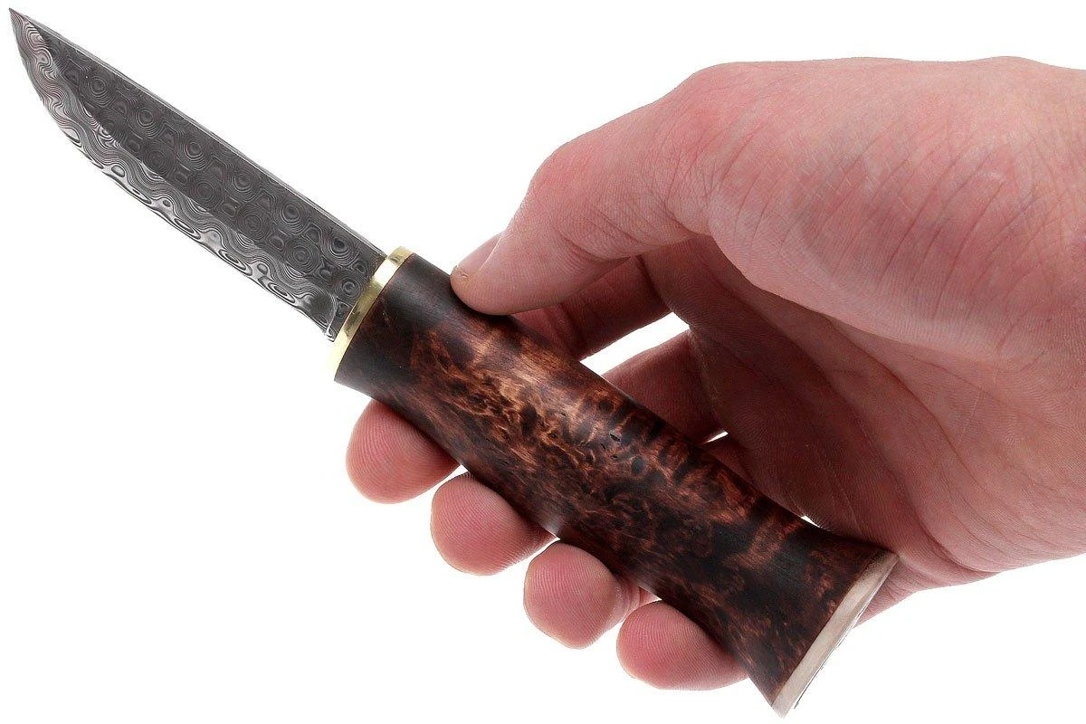 Das Karesuando Nulpu mit Damastklinge ist ein wunderschönes skandinavisches Messer, das in einer sehr schönen Geschenkbox geliefert wird. Wenn man die Holzkiste öffnet, weiß man sofort, dass man ein besonderes Messer in der Hand hält: Auf einem Bett aus Rentierfell winkt das Messer zum Greifen nah. In traditioneller Scheide, aus Maserholz und Leder. Der Knauf des Curly-Birch-Griffs ist mit einem schönen Rentiergeweih mit Gravur versehen. Wenn man das Messer aus der Scheide nimmt, bemerkt man sofort die wahnsinnig schöne Damastklinge. Geschmiedet aus 160 Schichten Pulverstahl mit fabelhaftem Aussehen, gehärtet auf 58HRC. Der dunkelbraune Griff und die Damastklinge sind durch eine Messingplatte getrennt.