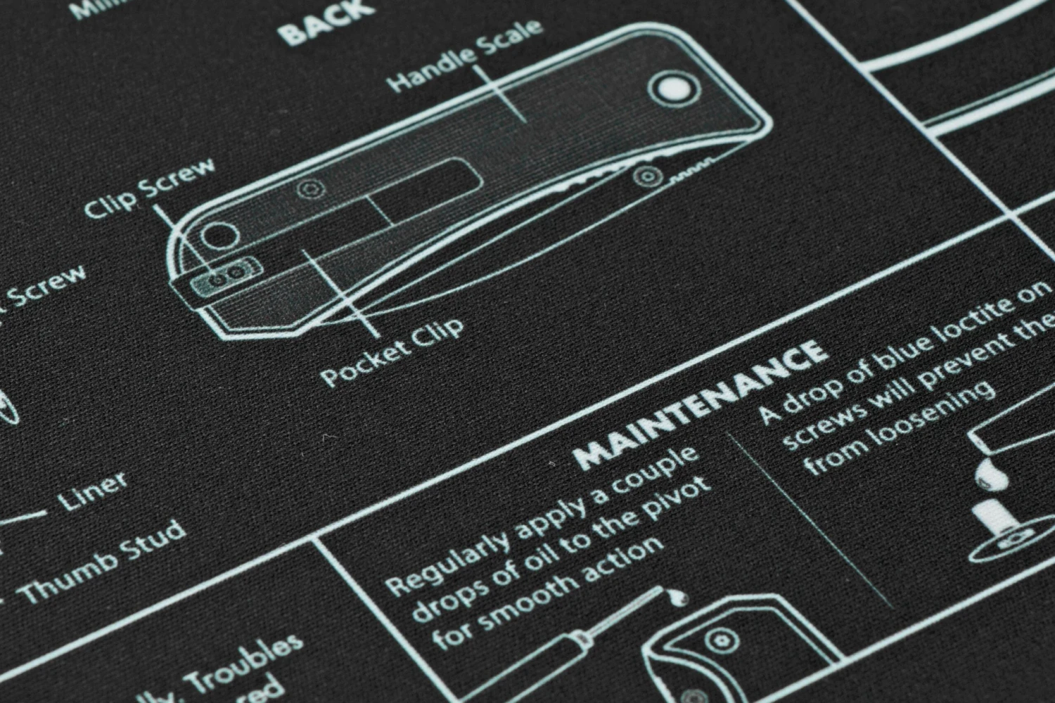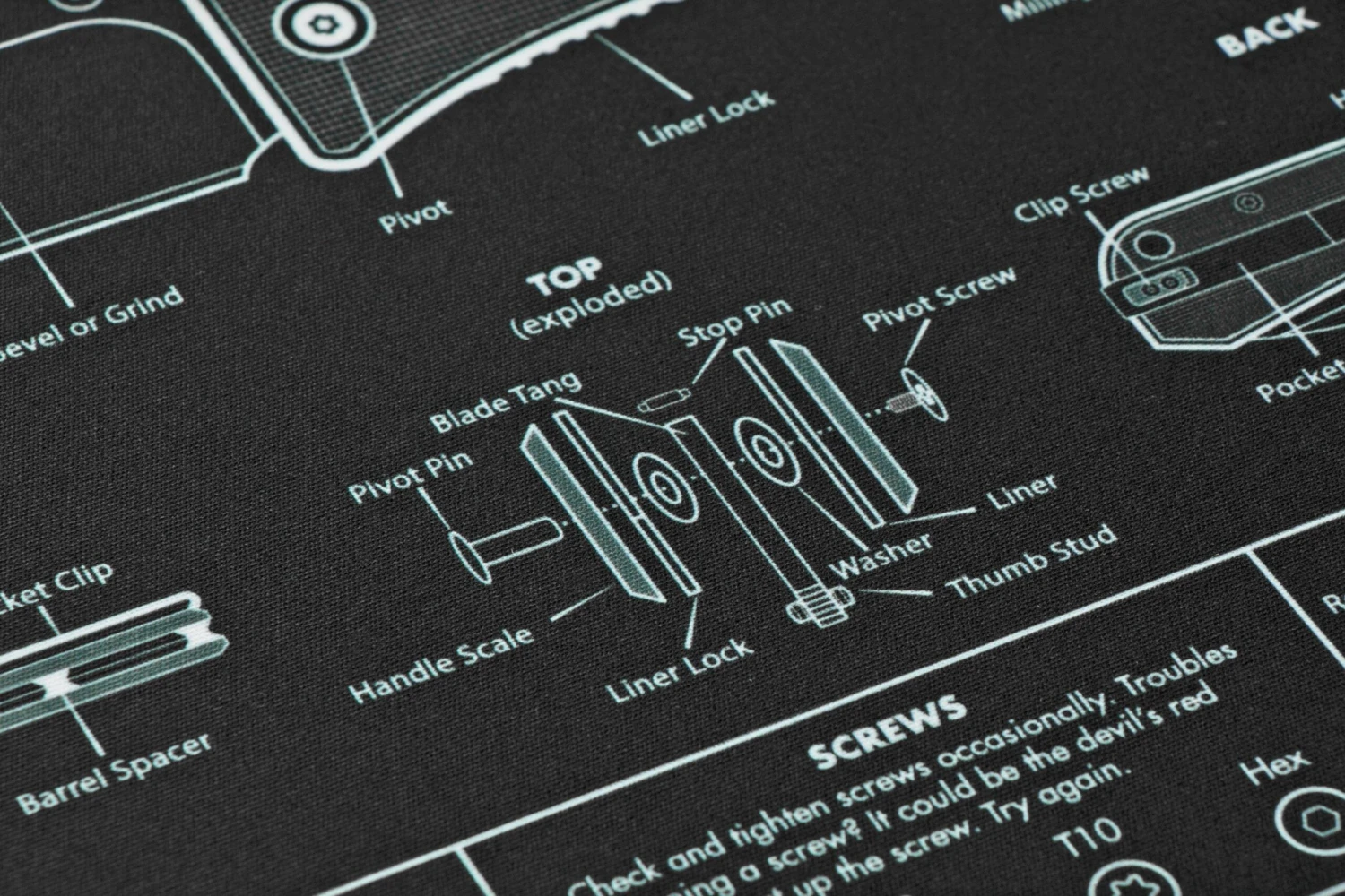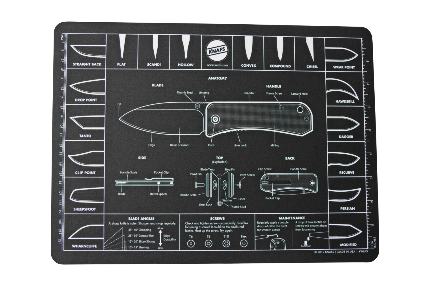 Dieses Knafs Knife Mouse Pad ist ein cooles Messerpad und Mauspad mit Messerinformationen. Die Anatomie eines Messers, Klingenformen und an den Seiten Größenangaben in Zoll und Zentimetern. Die obere Schicht besteht aus weichem Polyester, die untere aus einer rutschfesten Beschichtung. Für ein Mauspad ist es recht groß, sodass es sich auch perfekt als Unterlage eignet, wenn Du mit Deinen Messern arbeitest. Und dann hast Du sofort alle notwendigen Informationen über das Messer zur Hand.