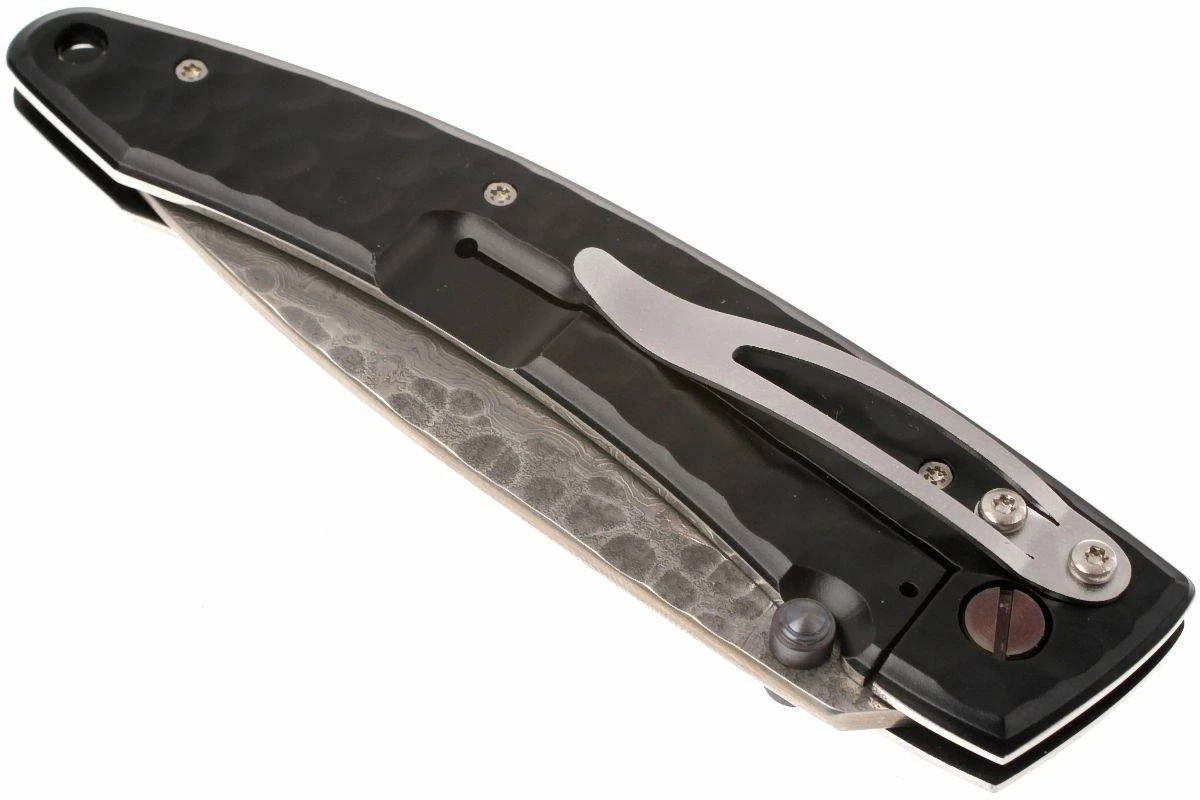 Das Mcusta MC-114BD Forge Shadow ist ein besonderes Herrenmesser. Im eingeklappten Zustand passt die Klinge aus Damaststahl mit gehämmerter Oberfläche hervorragend zum schwarzen Griff, der ebenfalls diese gehämmerte Oberfläche aufweist. Dies sieht man nur selten bei Taschenmessern, es ist beinahe einzigartig.