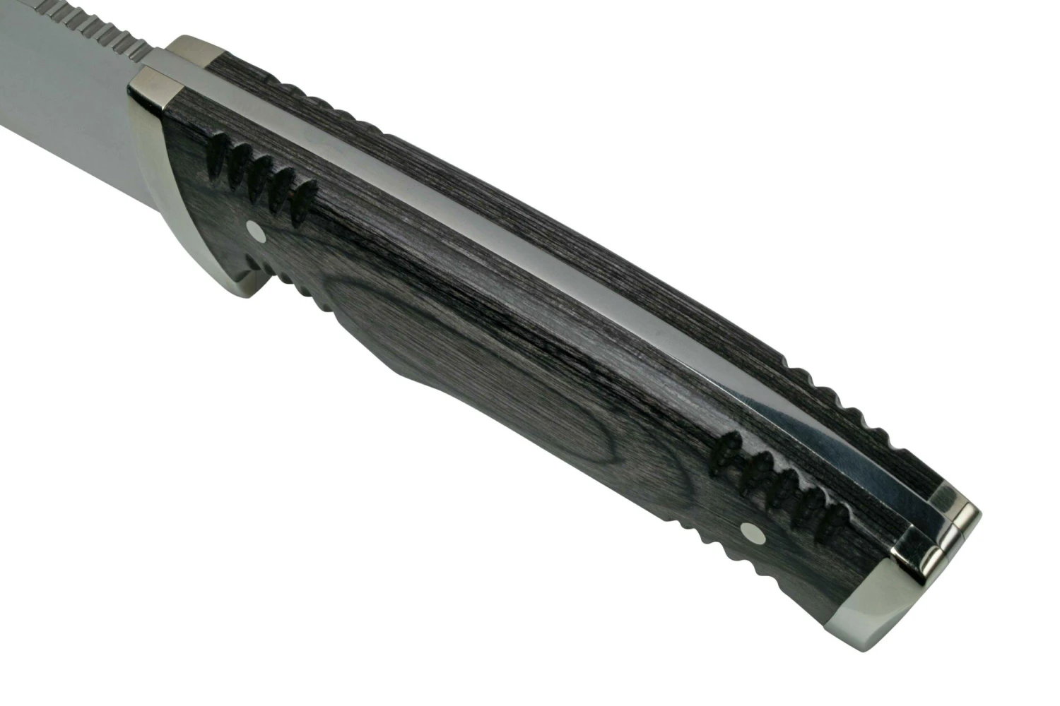 Das Old Timer Fixed Blade 1135992 ist ein großes Jagdmesser mit einem Griff aus laminiertem Holz. Durch die Fingerrillen liegt das Messer trotz seiner Größe sehr gut in der Hand. Die große Droppoint-Klinge hat ebenfalls eine Fingerrille. Sehr angenehm für präzisere Schneideaufgaben. Die Klinge hat außerdem einen Jimping auf dem Rücken, der den Halt beim Schneiden verbessert.