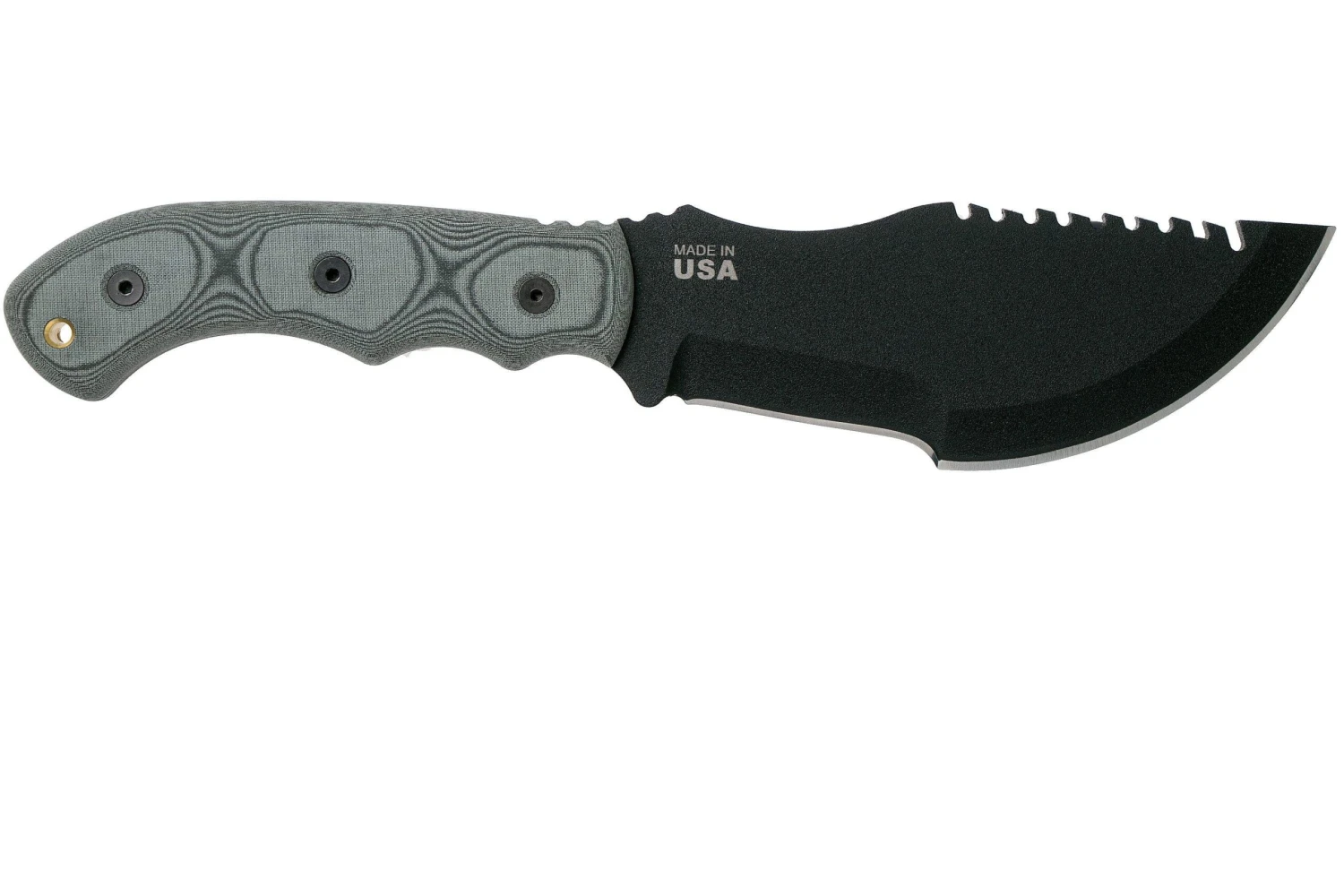 Das Tops Tom Brown Tracker ist ein besonders vielseitiges Survivalmesser. Dieses Messer ist das wohl bekannteste Messer im TOPS Produktsortiment, bekannt aus dem Kinofilm „Die Stunde des Jägers“. Die Modellserie Tracker wurde vom bekannten Fährtenleser und Survival-Experten Tom Brown II entwickelt, der seit 1978 in der Survival-Szene einen bekannten Ruf genießt. Mit seiner beeindruckenden Klingenstärke von 7,5 mm hält dieses Messer einiges aus. Mit seiner Zahnung auf dem Klingenrücken kann das Messer als Säge eingesetzt werden. Die erste Einkerbung ist etwas tiefer als die restliche Zahnung, mit ihr lässt sie sich beispielsweise der Eisendraht von Drahtzäunen aufbrechen. Die auffallende Rundung in der Mitte der Schneide eignet sich gut zum Abrunden von Holzteilen oder zum Aufbrechen von geschossenem Wild. Das beeindruckende und wuchtige Survivalmesser kann allerdings auch perfekt zum Hacken, Schneiden, Schaben, Sägen, Graben, Hebeln etc. eingesetzt werden. Die Klinge aus 1095 Kohlenstoffstahl verfügt über ein Black Traction Coating, dass gegen Rost schützt und Reflexionen verhindert. Der Micarta Griff mit subtilen roten Linern liegt angenehm komfortabel in der Hand und bietet auch unter nassen Umständen oder mit Handschuhen rutschfesten Halt.