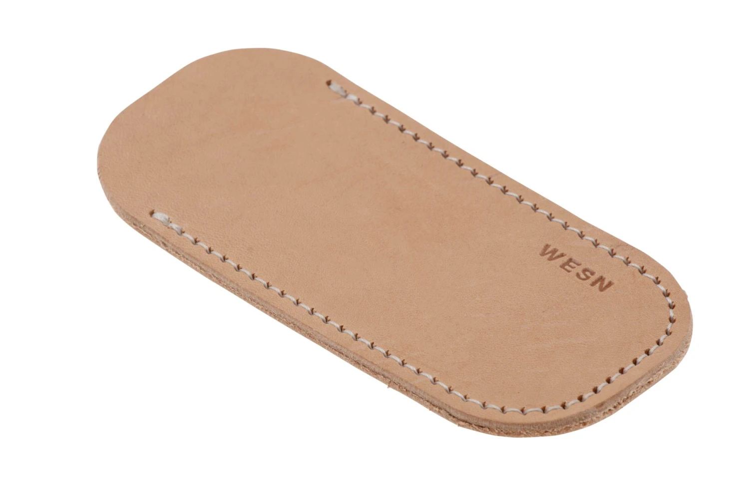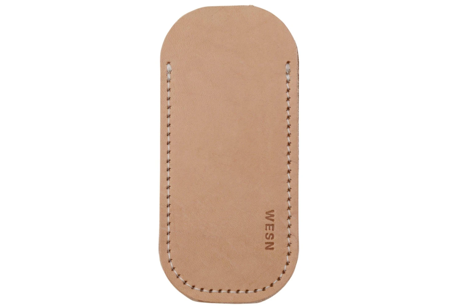 Die WESN Allman Leather Sheath Natural, SN09-0 ist eine einfache, unauffällige Lederscheide für das WESN Allman. Die Lederscheide ist seitlich mit weißen Nähten gestickt und sauber verarbeitet. Das Leder ist 1,2 mm dick und die Lederscheide besitzt keinen Druckknopf. Allein durch Reibung wird das WESN Allman an seinem Platz gehalten in der Scheide.