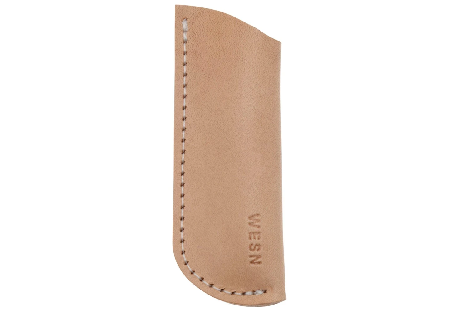Die WESN Samla Leather Sheath Natural SN16-0 ist eine einfache, unauffällige Lederscheide für das WESN Samla. Die Lederscheide ist seitlich mit weißen Nähten gestickt und sauber verarbeitet. Das Leder ist 1,2 mm dick und die Lederscheide besitzt keinen Druckknopf. Allein durch Reibung wird das WESN Salma an seinem Platz gehalten in der Scheide.